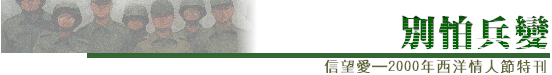 ![]() 作者:陳小小 我記得我老公(當年還是我的男友)去當兵時,第三個星期就寫信給我,說他們一堆人都「兵變」了......他還對我說,你要變就快一點吧!趁我還沒有很愛你,就兵變吧。 我們交往是在我老公去當兵的前一個星期開始。 其實我們兩人都會覺得當兵是很好的考驗!如果分手,就表示兩人不適合。對我們兩人而言,當兵對感情反倒是一種祝福。因為接受過這種分隔兩地的考驗後,我們相信日後即使婚後情感會生變的可能都會降至最低.... 所以你們分手,就當作是上帝的祝福吧!因為如果連當兵這關都過不了,婚後其實還有很多更難的關卡要度過呢!我老公常說,婚前的分手都是上帝的祝福,不要婚後才離婚那就非常可悲了....